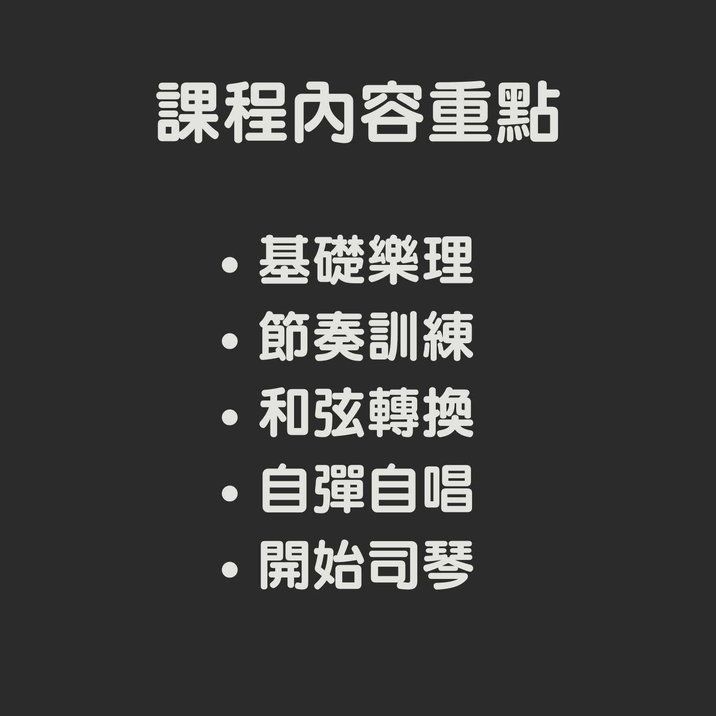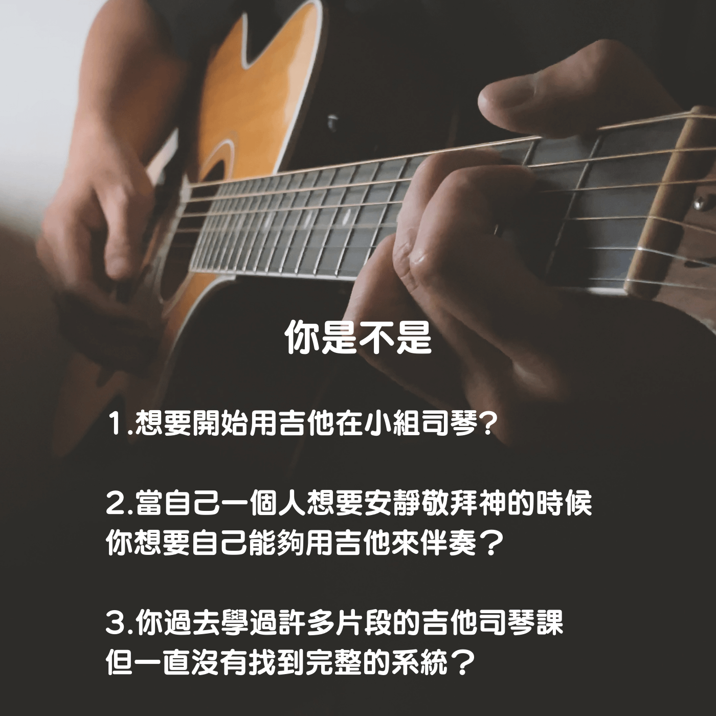 無論你是初學者還是希望提升技術的吉他手,我的課程都將幫助你在吉他的世界中找到屬於自己的聲音,並透過音樂感受到內心的平靜與喜樂。